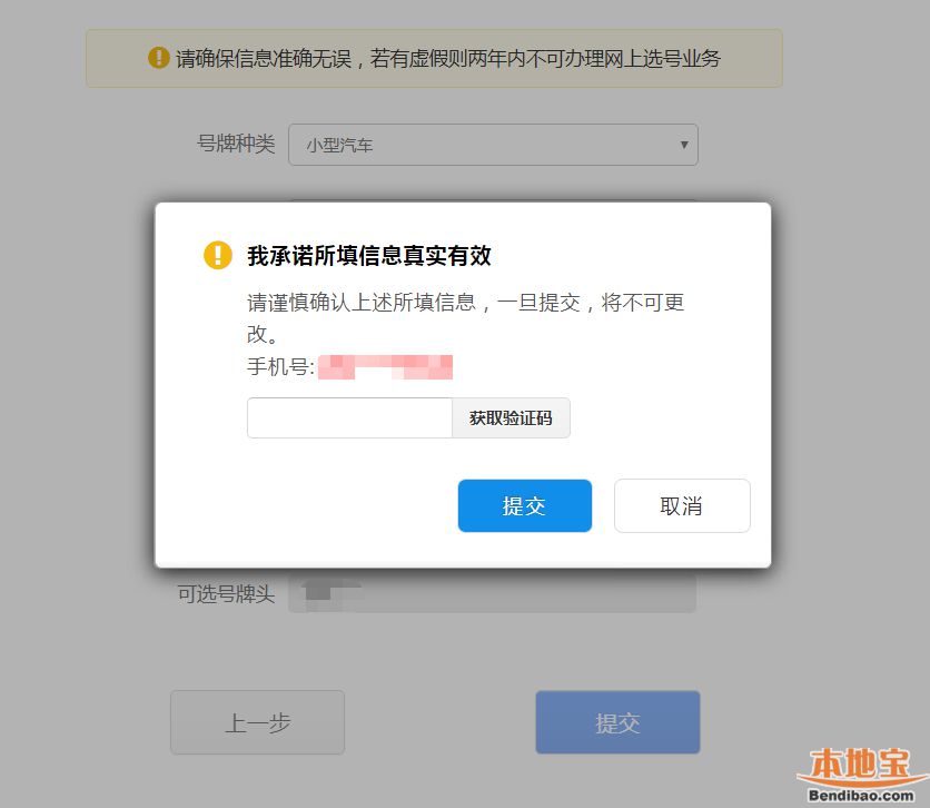 用户输入车辆识别代号、选号凭证后,点击【提交】按钮, 系统会检查车辆识别代号的正确性,若验证不通过,则会显示验证不通过原因,若验证通过,会弹出确认提交的对话框,如下图所示。