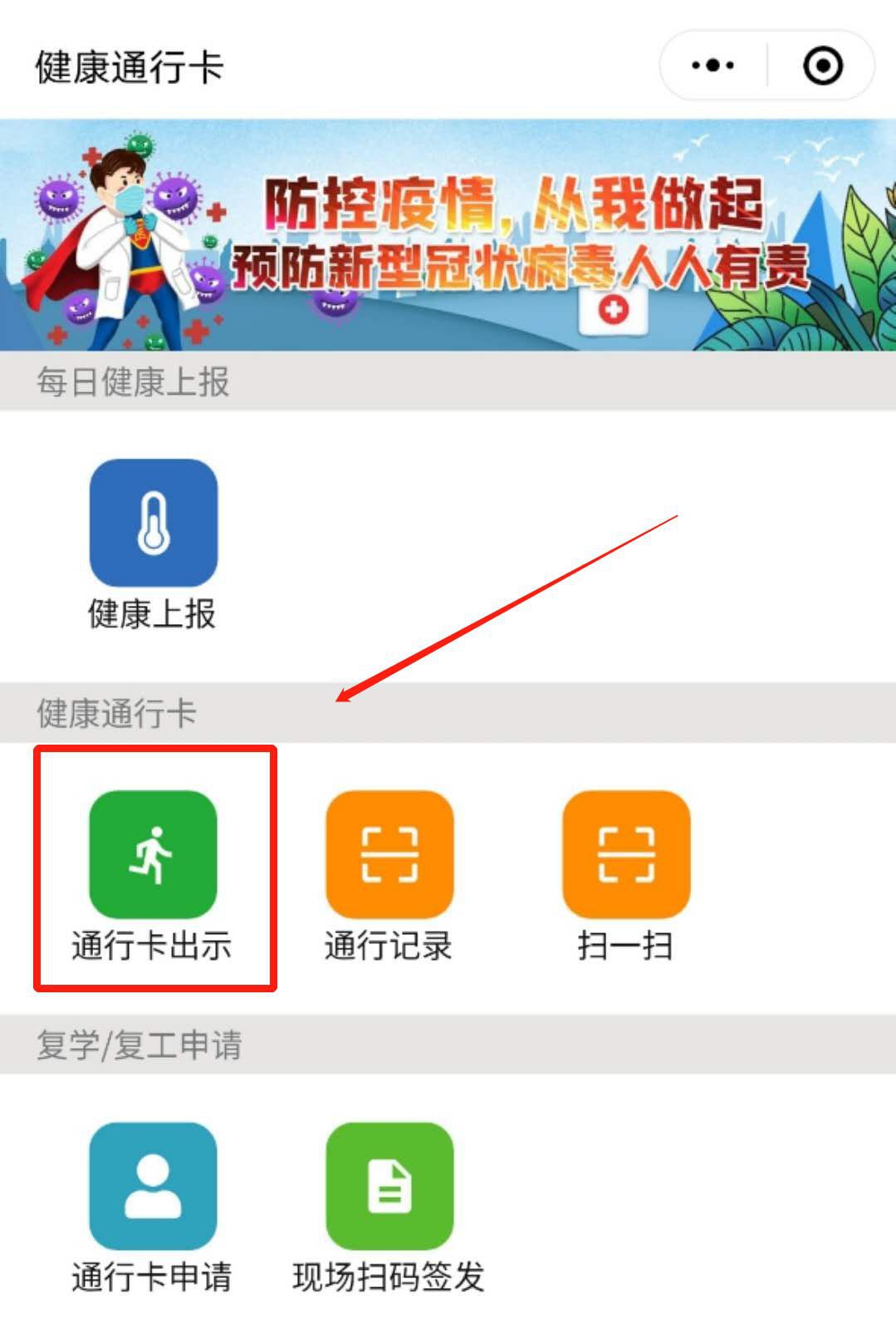 健康码的使用:根据需要,进入入口,出行人点击“健康通行卡”栏目,选中“通行卡出示”(如下图),管理人员对出示“绿色健康通行卡”的出行人直接放行。管理人员可根据当地疫情防控需要,点击“健康通行卡”栏目后,选择“扫一扫”查看出行人详细信息。