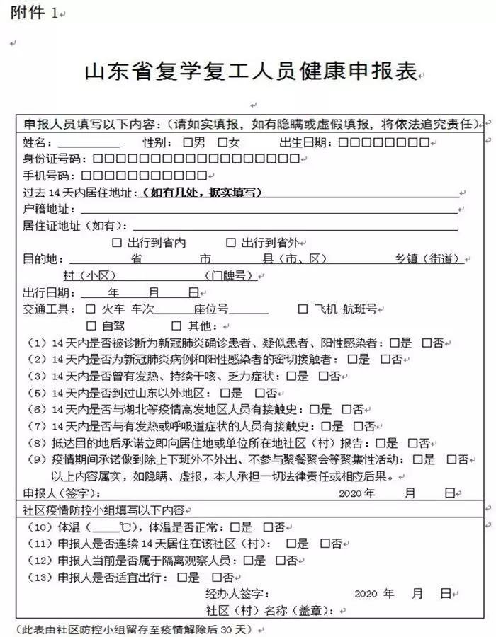 2、下载《山东省复学复工人员健康申报表》,样式如下: