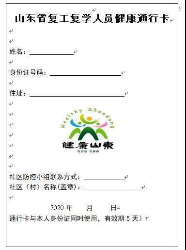 ▼山东省复工复学人员健康通行卡(样式)▼