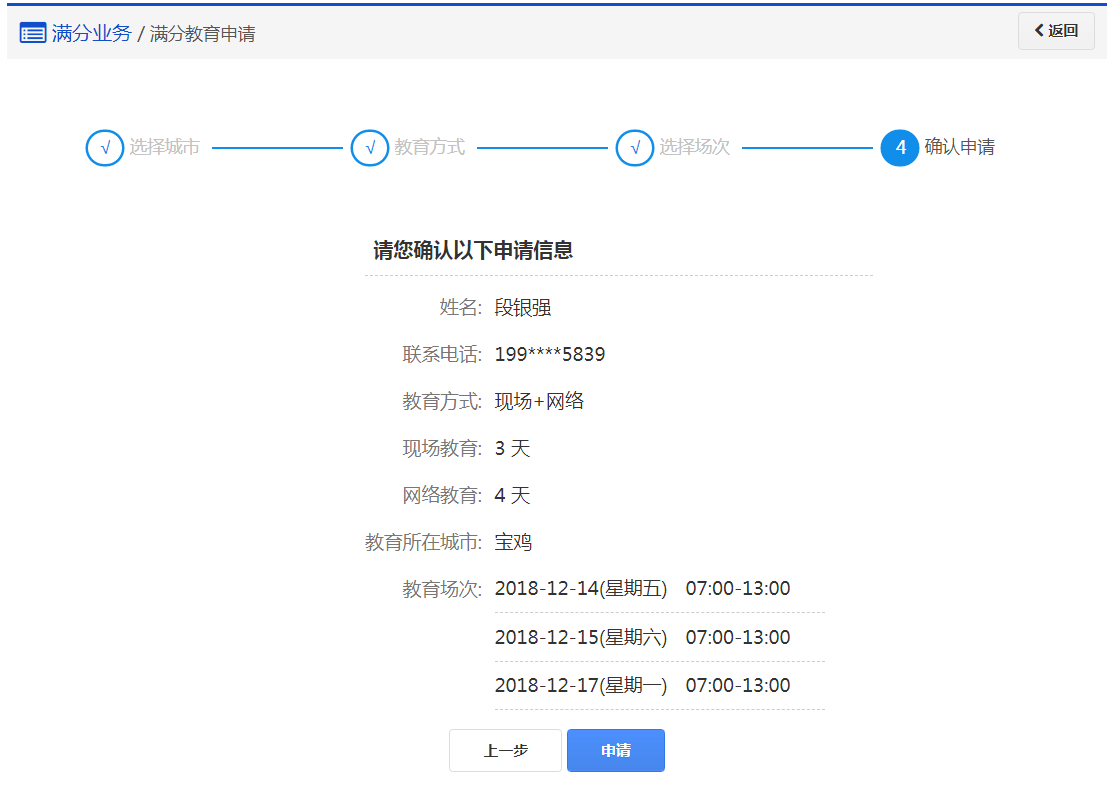 在该步骤,用户已申请成功,请在规定的时间内参加相应的教育场次完成满分教育。