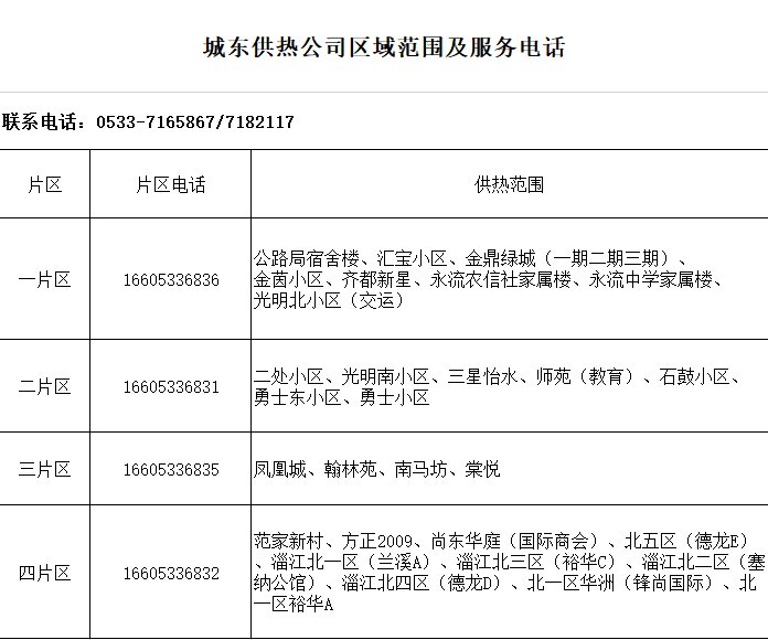 城东供热公司区域范围及服务电话